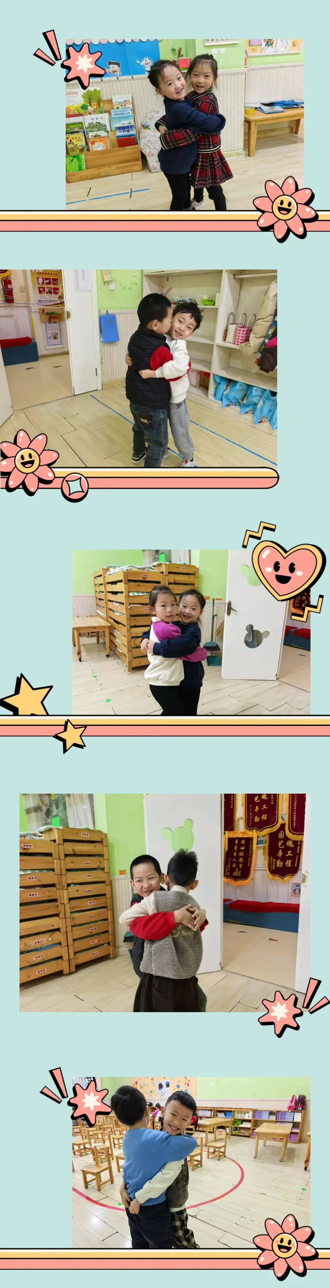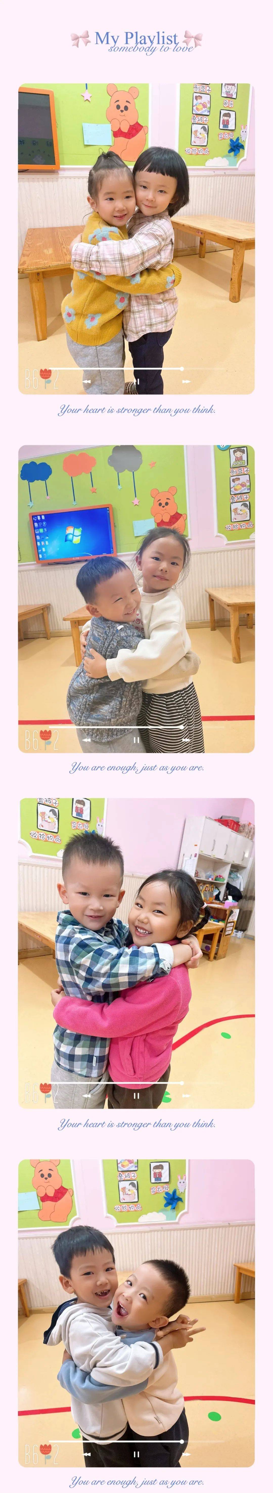 拥抱是一种取暖的方式,是用身体表达爱的语言。在幼儿园,我们爱着许多人。老师引导孩子们把拥抱送给幼儿园里的每一个人,来表达他们暖暖的爱意!