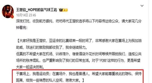 现在某些粉丝的心态特别拧巴。他们把运动员当自家财产,谈个恋爱要粉丝批准,结个婚得像选秀节目投票。运动员在场上拼死拼活,下了场连私生活都要被扒得底朝天。王楚钦去年就说过,运动员场外也是普通人,需要隐私尊重。可现实呢?键盘侠们对比赛细节一知半解,对选手的戒指款式、领证时间倒是研究得门儿清。
